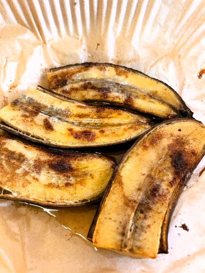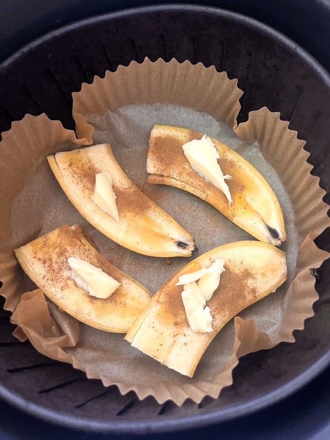- Coloque as metades das bananas na airfryer, com a casca virada para baixo.