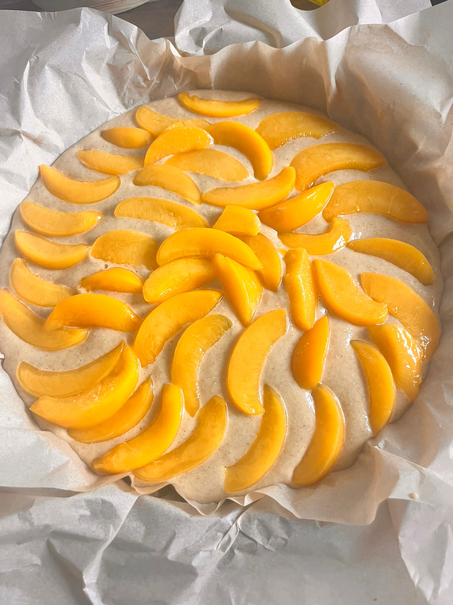 Dispor os pêssegos: Distribua as fatias de pêssego em meias-luas por cima da massa, de forma a criar um padrão visual agradável.