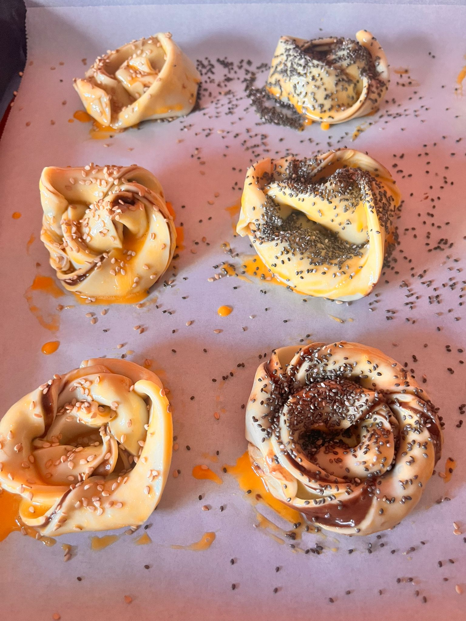 - Pincele os rolinhos com a gema de ovo batida para ficarem dourados.