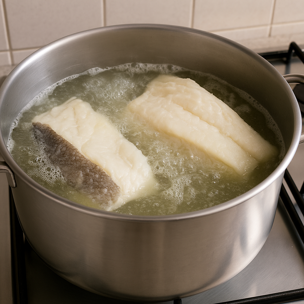 - Coloque um tacho com água (sem sal) ao lume e, quando ferver, adicione as postas de bacalhau. Deixe cozinhar por cerca de 10 minutos. Retire, elimine peles e espinhas e desfie em lascas. Reserve.