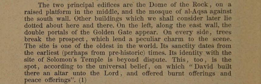 “O local é um dos mais antigos do mundo. A sua santidade remonta aos tempos mais remotos. A sua identificação com o local do Templo de Salomão é indiscutível.”