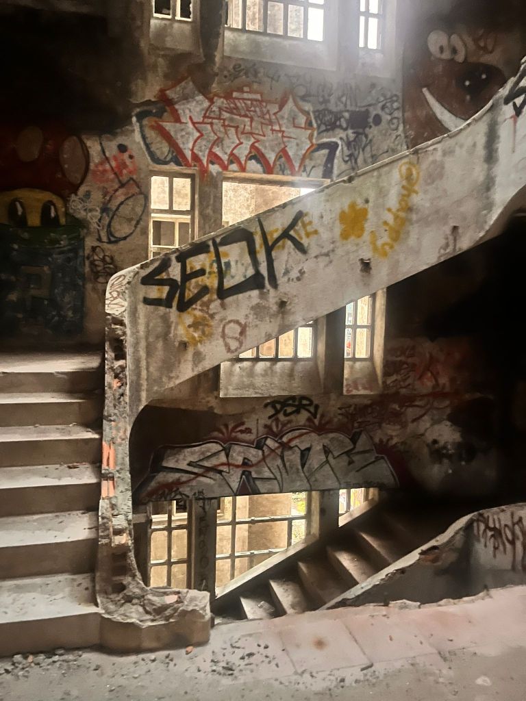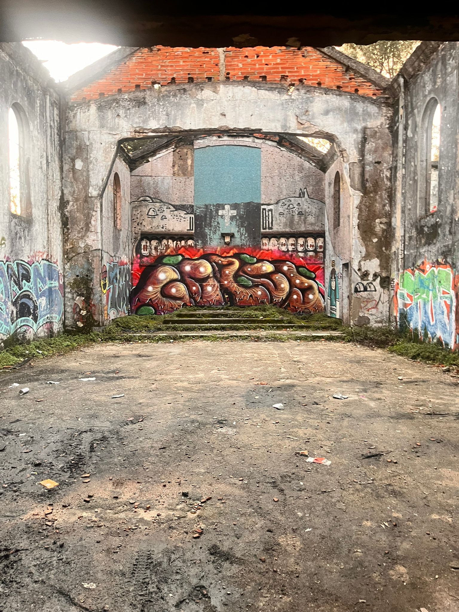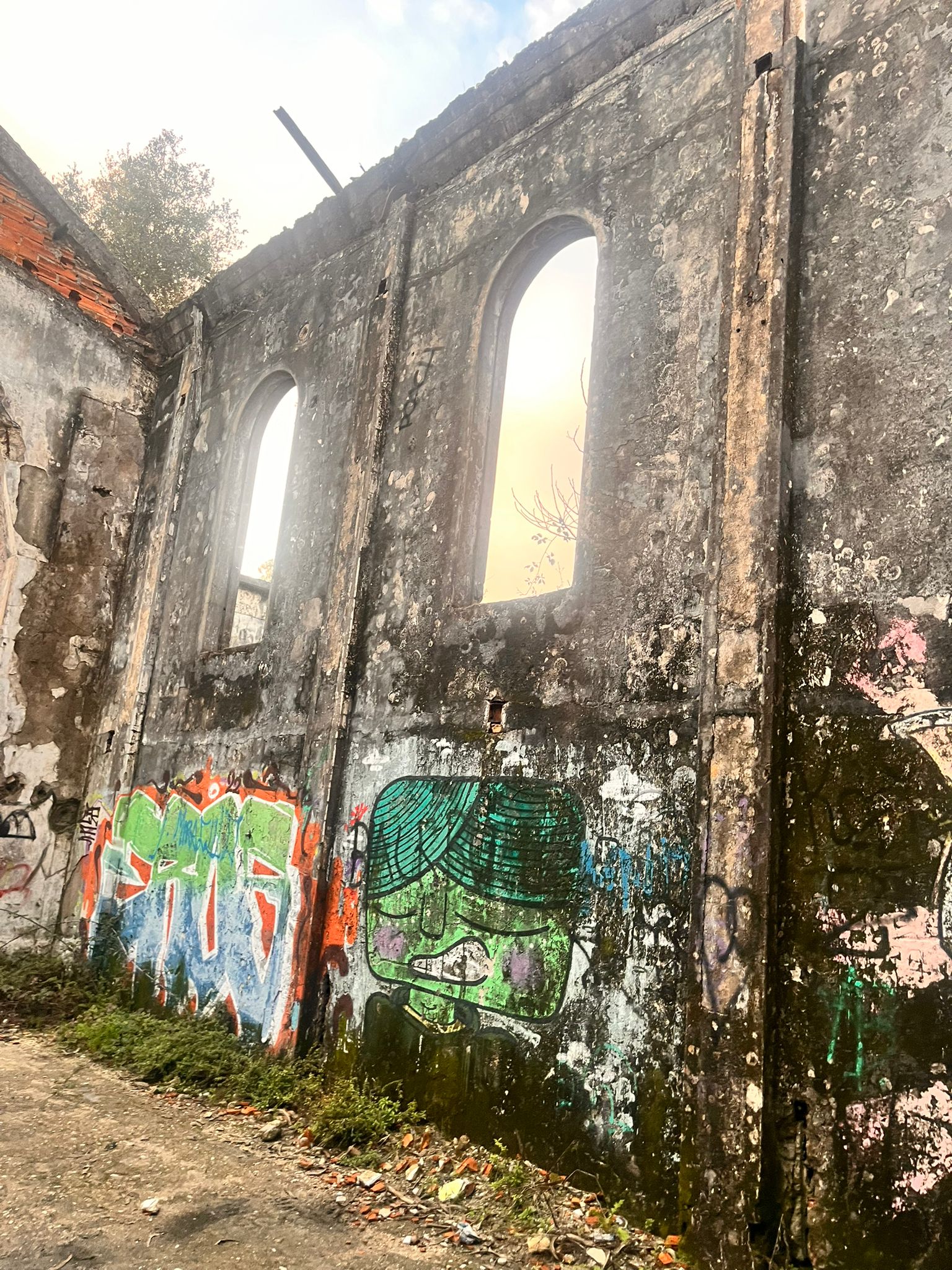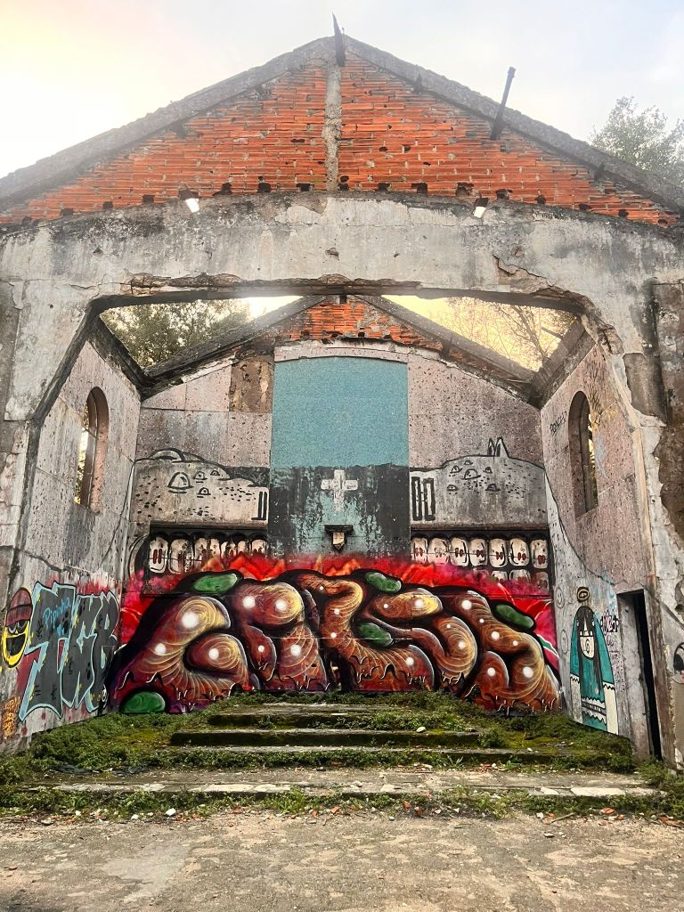 Hoje, o cinza do betão mistura-se com grafitis coloridos. A arte urbana ocupa paredes, corredores e antigas enfermarias, criando um contraste curioso entre decadência e criatividade. O edifício está muito degradado, é verdade, mas há algo de profundamente fotogénico em cada canto.