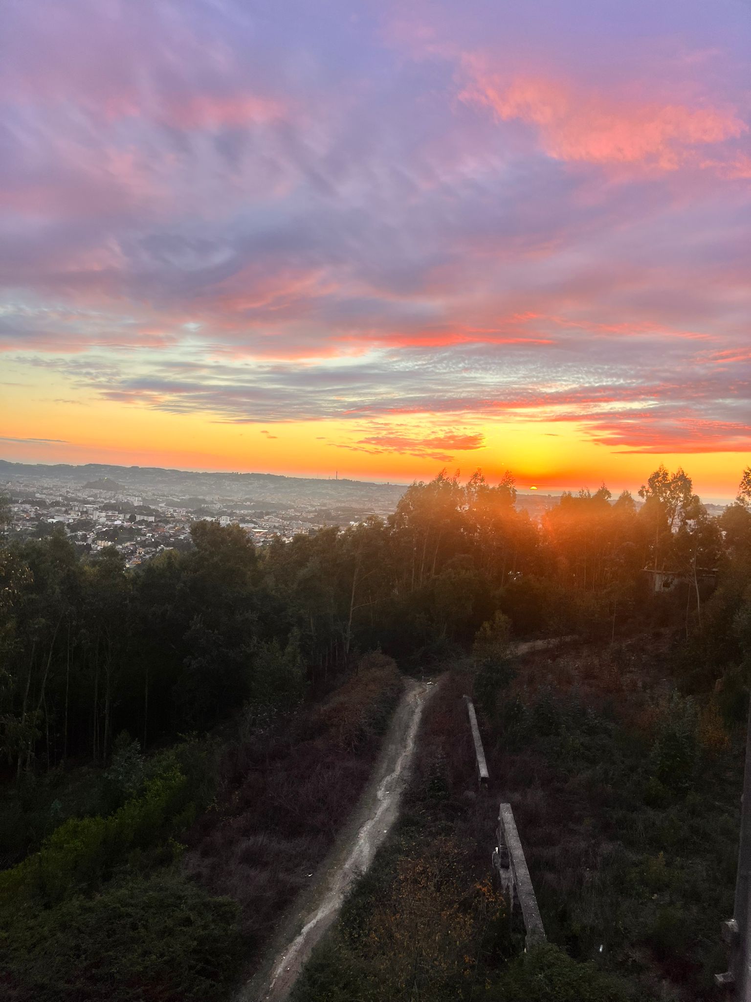 Lá de cima, a vista é simplesmente deslumbrante. A serra, o verde, o horizonte e, ao longe, o mar. Um pôr do sol daqueles que nos faz parar, respirar fundo e esquecer por momentos tudo o resto. As fotografias ficam fenomenais, mas nenhuma imagem consegue captar totalmente o que se sente naquele instante.