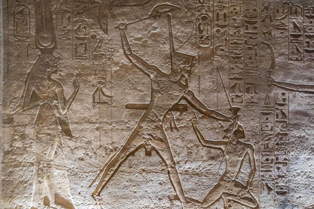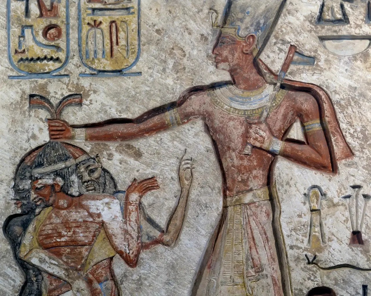 Desde as primeiras representações, como na Paleta de Narmer, o faraó surge esmagando inimigos. Não é apenas propaganda: é ideologia.