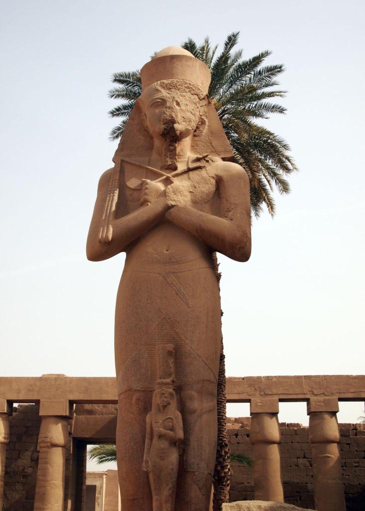 A coroa branca do Alto Egito, a vermelha do Baixo Egito, unidas na coroa dupla. O mangual e o cajado. A postura rígida e frontal nas estátuas. Nada era casual.