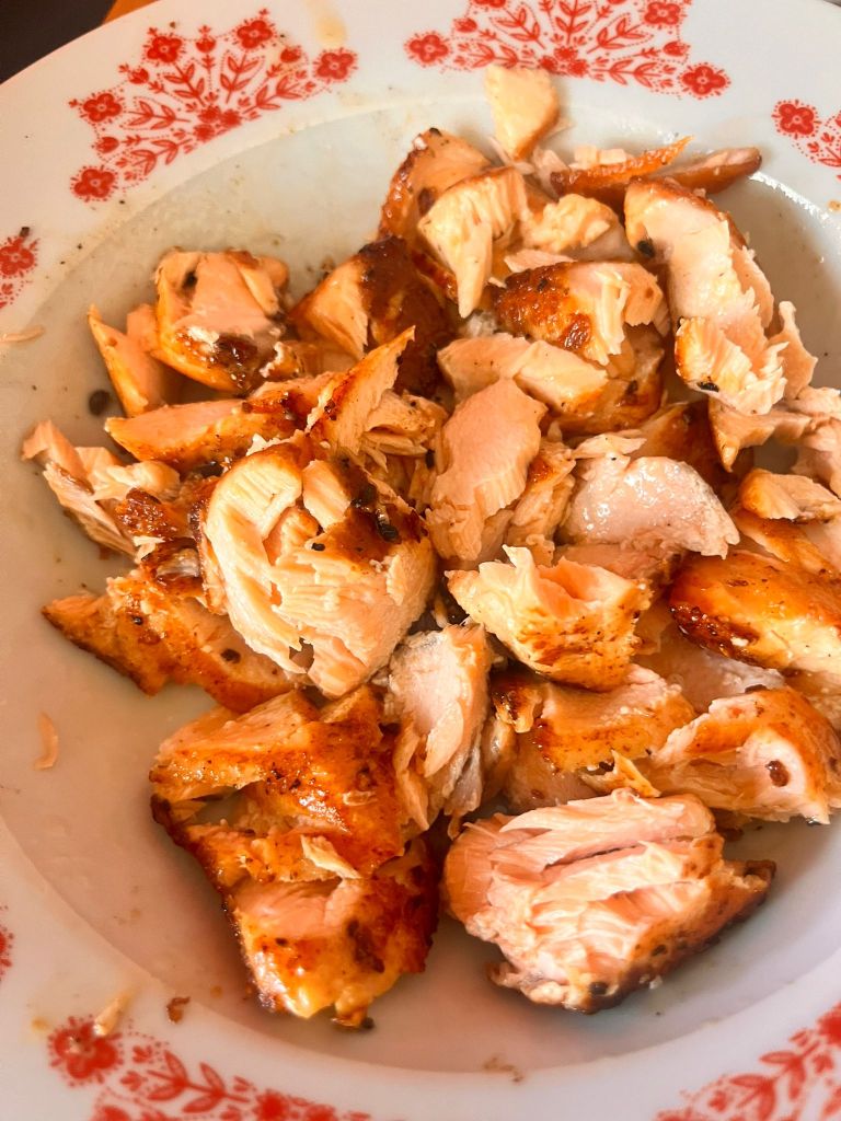 Comece por temperar o salmão com sal, alho picado e sumo de limão. Deixe marinar por alguns minutos para ganhar sabor. De seguida, grelhe o salmão numa frigideira com um fio de azeite até ficar bem cozinhado e ligeiramente dourado.