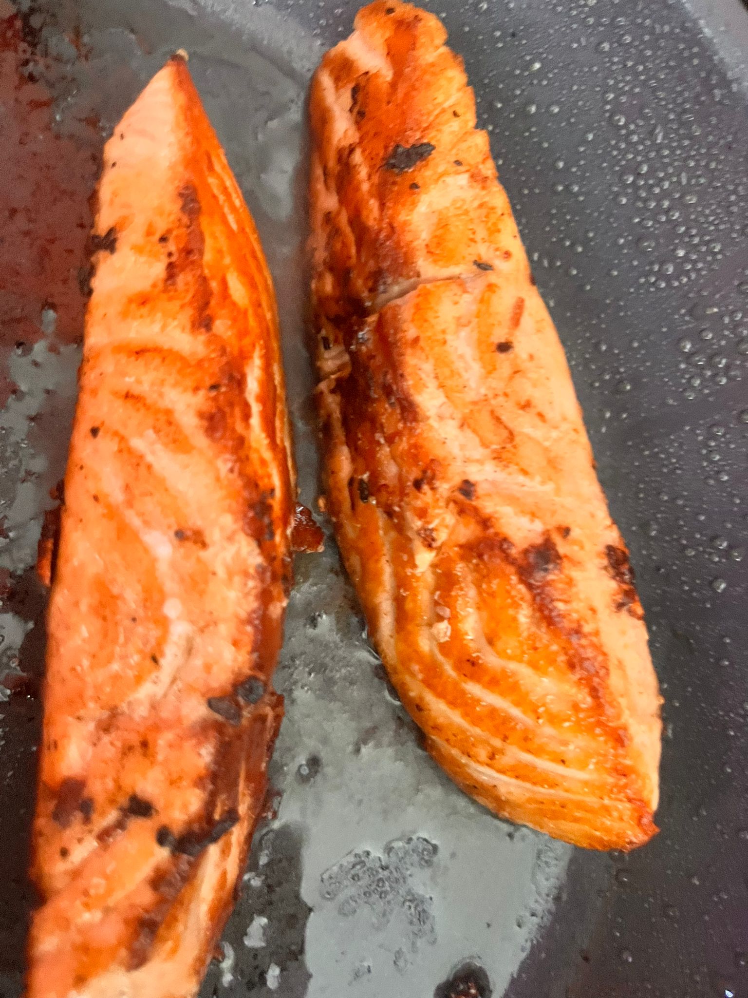 Comece por temperar o salmão com sal, alho picado e sumo de limão. Deixe marinar por alguns minutos para ganhar sabor. De seguida, grelhe o salmão numa frigideira com um fio de azeite até ficar bem cozinhado e ligeiramente dourado.